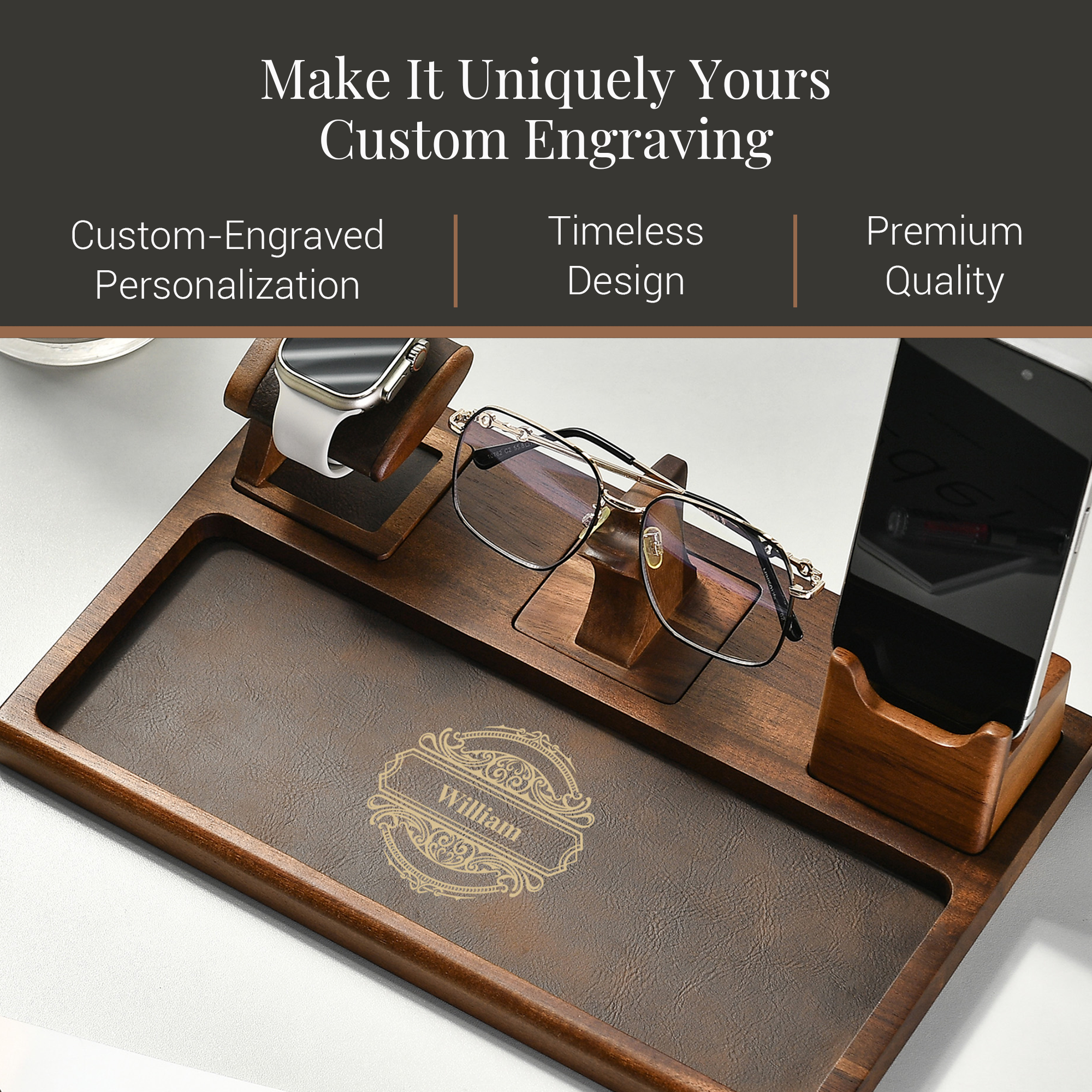Personalized Docking Station Nightstand Organizer Wood Anniversary Mens Valet Tray with Watch Glasses & Phone Stand EDC Tray