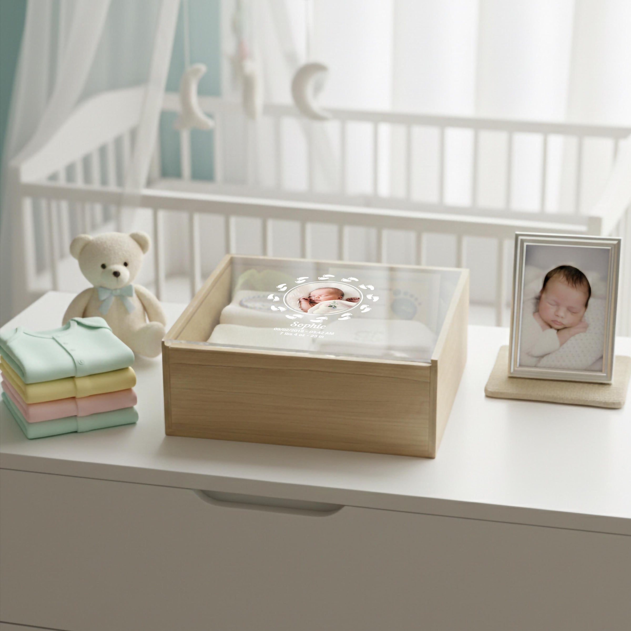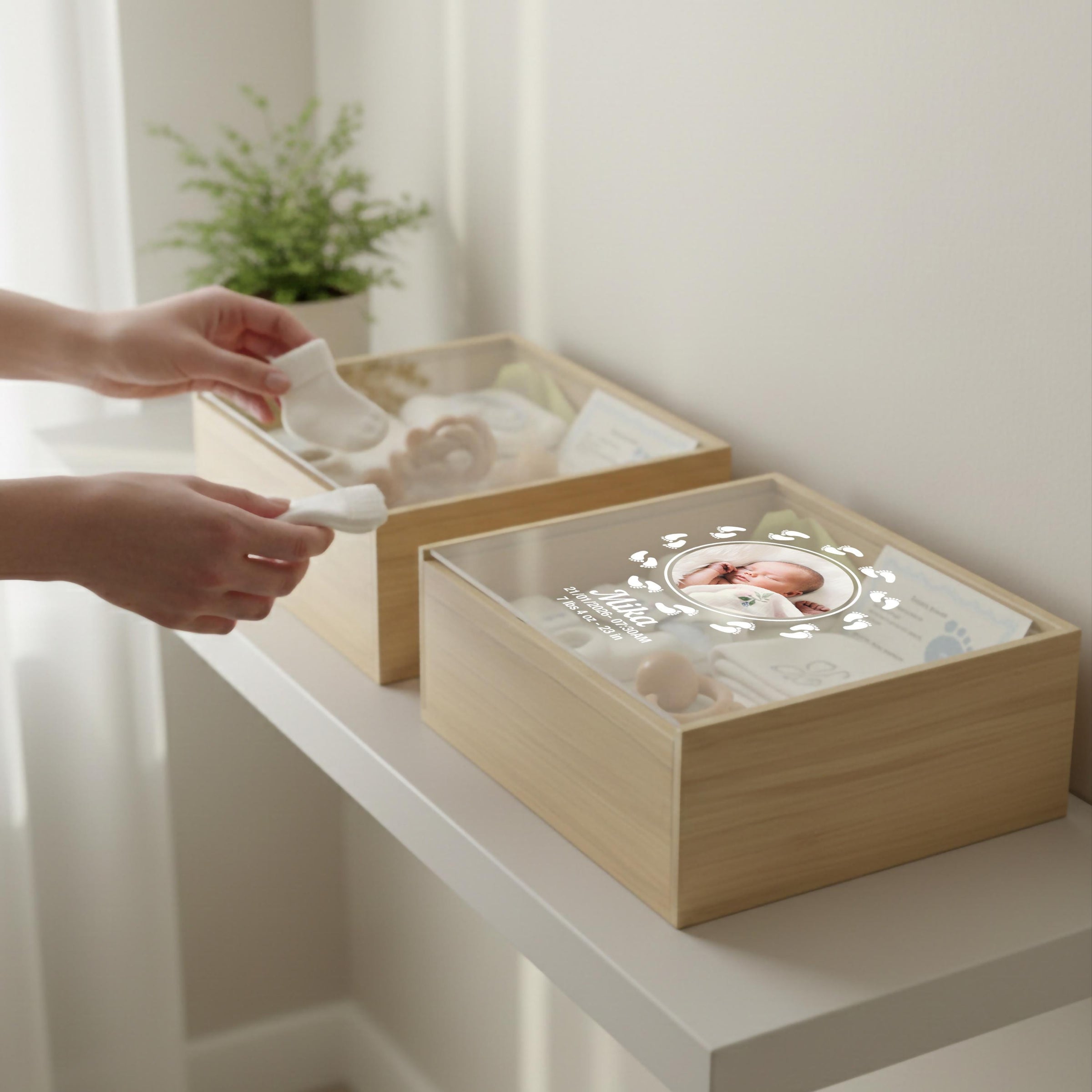 Minimalist baby memory box with clear lid print baby photo birth stats organic nursery decor newborn milestone storage gift for new mom
