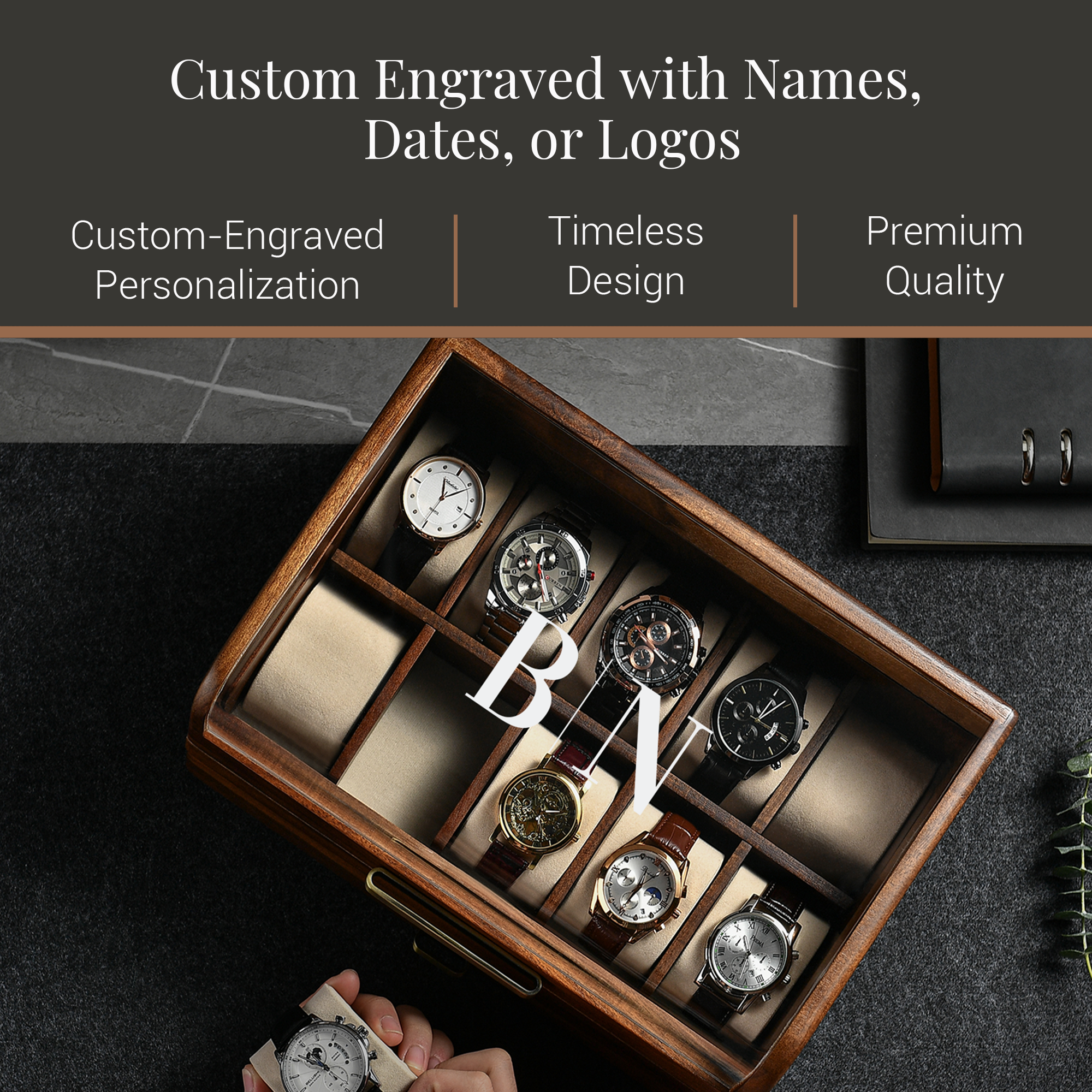 Premium Engraved Collector’s Watch Display Case Christmas Gift for Him Acacia Office Desk Watch Storage Organizer for Workspace